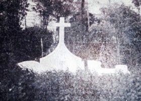 (weißes Steindenkmal mit Seitenflügeln gekrönt von einem Kreuz). Über Namen und