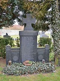 1. Weltkriegs aus schwarzem Granit. In der Mitte dominiert oben ein steinernes Ehrenkreuz, links und rechts