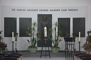 Heimatvertriebenen. Im Innern der Trauerhalle befinden sich vier Schrift- und eine Bildtafel mit den