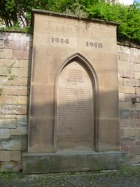 Torbogenförmiges Denkmal an der Kirchhofmauer in Obereisesheim. In der Toröffnung die Namen der