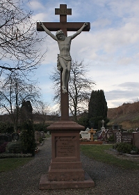 Oberrotweil (Friedhof), Stadt Vogtsburg im Kaiserstuhl, Landkreis Breisgau-Hochschwarzwald, Baden-WürttembergPLZ 79235 Im Friedhof auf einem Sockel, ein Kreuz mit Heiland, Inschriften