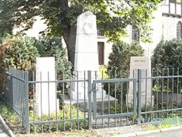 Drei Steinsäulen, die Mittlere sich nach oben verjüngend, in einem umzäunten Areal. Mit Inschrift und den Namen der Weltkriegesopfer.