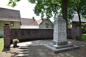 Evangelische Kirche: Im Garten der evangelischen Kirche befindet sich auf der linken Seite ein Ehrenmal für die Opfer der beiden Weltkriege. Es besteht aus einer halbrunden Mauer aus Michelnauer Bruchsteinen mit jeweils einer Schale als Abschluss. An der Vorderseite sind sechs große Bronzetafeln mit Namen eingelassen, in der Mitte befinden sich ein Bronzekreuz mit Jahreszahlen und Schriftzug sowie mehrere kleinere Erinnerungstafeln für die ermordeten jüdischen Einwohner. In der Mitte vor der Mauer steht auf einem dreistufigen Sockel das Denkmal für die Gefallenen des Ersten Weltkriegs. Es besteht aus einer rechteckigen Säule aus Zementstein mit Ehrenkreuz, Lorbeerkranz und oben aufliegendem Helm auf einem Kranz. Auf der Vorderseite befinden sich die Jahreszahlen des Krieges und ein Sinnspruch. An zwei Seiten sind die Namen der Gefallenen eingemeißelt. An der vorderen Außenwand der Kirche ist eine schwarze Erinnerungstafel mit Sandsteinumrandung zum Andenken an die Kriegsteilnehmer von 1866 und 1870-71 eingelassen.