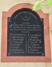 von dem Krieger & Militär-Verein Okaben am 27.6.1903 den im Jahre 1866-70/71 aus der Gemeinde ausmarschierten Kriegern 1. Weltkrieg: 1914-18 Wer im Kampf für die Heimat sein Leben gegeben, wird im Gedächtnis der Heimat stets weiter leben. Im Weltkrieg 1914-18 haben aus Okarben ihr Leben gelassen (Namen) 2. Weltkrieg: † 1939 1945 DEN TOTEN ZUR EHRE DEN LEBENDEN ZUR LEHRE GEFALLEN: (Namen) VERMISST: (Namen) UNSERE JÜDISCHEN BÜRGER DEPORTIERT UND ERMORDET (Namen) UNVERGESSEN VERUNGLÜCKT AM 14. APRIL 1946 IN OCKSTADT (Namen) Sandsteintafel in der Friedhof-Trauerhalle: WIR TRAUERN UM DIE OPFER DER KRIEGE UND GEWALTHERRSCHAFT SIE SOLLEN UNS MAHNUNG SEIN