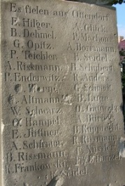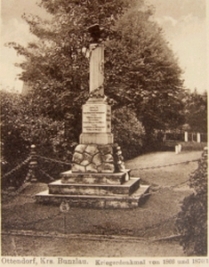 1866; 1870/71: Es starben den Heldentod für König u. Vaterland. ----------------------------- Wer kühn und todesmutig Im Kampfe sich bewährt. Des Name wird von Freunden Und Feinden hochgechrt. Denkmalbau: T. Thust Breslau 1. Weltkrieg: Unseren im Weltkriege 1914-1918 gefallenen Helden. Gewidmet von den dankbaren Mitgliedern aus der Gemeinde Ottendorf.