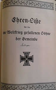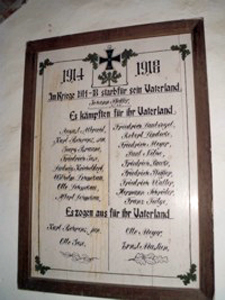 Gedenktafel in der Kirche und Ehrenliste für die Gefallenen des 1. Weltkriegs. Namen der Gefallenen des 2. Weltkriegs aus Archiven.