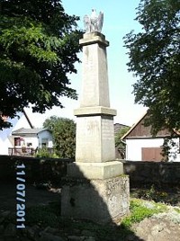 Steindenkmal, welches sich nach oben verjüngt. Als Abschluss der Reichsadler. Mit Inschrift und den Opfernamen des 1. Weltkrieges