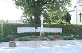 Denkmalsanlage in Rundbogenform. Granittafeln mit Inschrift und den Namen der Kriegsopfer. Mittig ein großes „EK“ aus Stein. Davor auf einem Podest befindliche Rundsäule mit einer lebensgroßen Muttergottes. Mit einer Hecke umsäumt und Blumenbepflanzung, als Dekor.