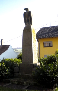 Gelände der evangelischen Kirche: Sandsteinstele mit Adler obendrauf, auf Vorder- und Rückseite