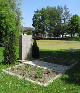Das Granitdenkmal steht am Weiher im Dorfzentrum