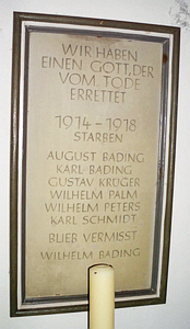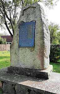Denkmal für die Gefallenen des 1. Weltkriegs: aufgerichteter Findling auf stufenförmigem Feldstein Sockel. Gedenktafeln in der Kirche. Ehrenliste für die Gefallenen des 1. Weltkriegs. Soldatengrab.