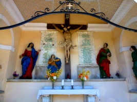 Tafeln mit Namen in einer Kapelle an der Friedhofsmauer