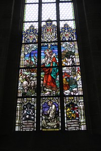 Im Heilig-Geist-Münster Gedenktafeln in zwei Nischen, Widmung an einem Kirchenfenster