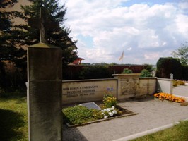 Denkmal 2. Weltkrieg mit den Namen der Gefallenen des Ortes auf einer Mauer Umfriedung um die Kriegsgräberstätte mit den Namen dieser vor Ort gefallenen auf einer Metalltafel; beeindruckende geschnitzte Holz-Gedenktafel für den 1. Weltkrieg in der Kirche; Gedenken auf Familiengräbern