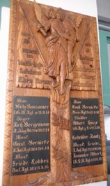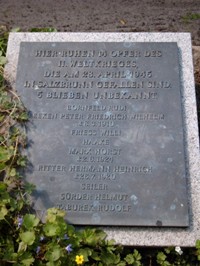 Von den Namen der vor Ort Gefallenen sind anscheinend zuerst nur die Namen HAAKE und SEILER bekannt gewesen und neben den örtlichen Gefallenen auf der Wand aufgeschrieben. Später wurden dann anscheinend mehr Namen bekannt und es wurde eine Metall Tafel angefertigt mit diesen zwei Gefallenen und weiteren Namen. Leider ist die Aufteilung der Namen dort so unübersichtlich daß man einige Vornamen für Nachnamen halten kann. Der Gefallene FEEKEN hat vor Ort die Vornamen Peter Friedrich Wilhelm, in der VdK Datenbank aber Peter Friedrich Esens. Zusätzliche Informationen in Blau vom Volksbund Deutsche Kriegsgräberfürsorge: (www.volksbund.de/graebersuche)