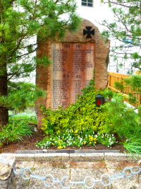 Natursteinblock eingefriedet mit Ketten vor der Kirche