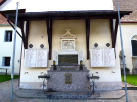 Marmorsockel und tabernakelartigen Aufsatz mit metallener Namenstafel von 1. Weltkrieg und flankiert von