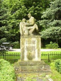einem Eisenzaun umgeben, das Ehrenmal für die 24 Opfer des Ersten Weltkrieges. Auf einem Sockel die Plastik