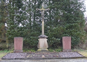 Im Friedhof ein Hochkreuz mit Heiland, flankiert von zwei Gedenktafeln; zusätzlich Hinweise zu Soldaten von
