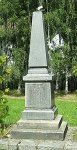 Einzeln stehender Obelisk auf einem Wiesenstück an der Straße der Befreiung