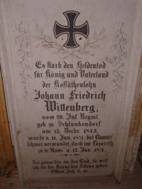 Tafel 1870/71: Es starb den Heldentod für König und Vaterland der Kossäthensohn Johan Friedrich