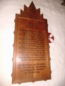Gedenktafel für die Gefallenen des 1. Weltkriegs in der Kirche. Ehrenliste für die Gefallenen des 1. Weltkriegs. Gedenken auf Erbbegräbnisstätte derer von Rundstedt.