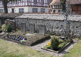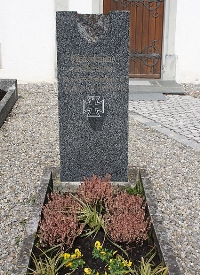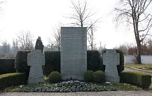Auf dem Friedhof im Ortsteil Seefelden; drei aufrechte Gedenktafeln, die äusseren in Kreuzform, ferner eine