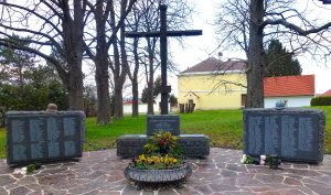 Freistehendes Metallkreuz mit Gedenkstein davor und flankiert