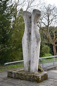 Der Weg führt über Treppenstufen zur Steinfigur ohne Kopf und Arme, mit 14 Hockern aus Beton auf