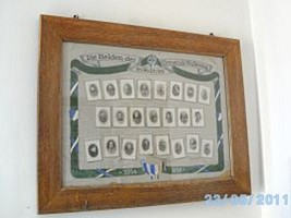 Holzumrahmte Gedenktafeln mit Inschrift, Fotos und den Namen der Weltkriegsopfer in der Ortskirche