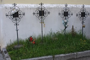 Im Friedhof vier schmiedeeiserne Kreuze mit Plakette