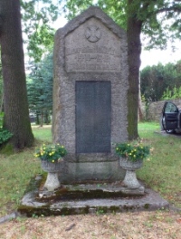 Grob behauener Steinquader mit Dreieckabschluss vor dem Kirchhof, der auch für Dobeneck errichtet wurde.