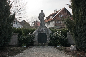Im Friedhof ein Naturstein mit Gedenktafel, oben Steinplastik „stehender Soldat“, flankiert von zwei stehenden Gedenksteinen; zusätzlich Hinweise zu Soldaten von privaten Gedenksteinen