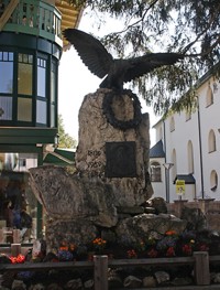 Beim Gemeindeamt Denkmal aus Natursteinen, oben mit Adler, Bildnis und Jahreszahlen