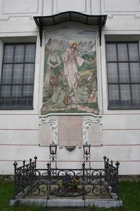 Aussen an der Kirche; Gedenktafeln, darüber Bildnis „Jesus segnet Sterbenden“