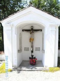 Halboffener Kapellenbau mit großem Kreuz mittig und Inschrift. Links und rechts an den Wänden die Namenstafeln der Weltkriegsopfer und des Frankreichfeldzuges.