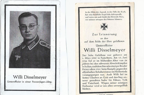 Gefallen im blühenden Alter von 24 Jahren bei den schweren Abwehrkämpfen in Italien, nachdem ihm sein einziger Bruder Heinz schon 1941 beim Kampfe gegen den alljüdischen Bolschewismus im Heldentode vorangegangen war. Auch Willi fiel im festen Glauben an Gott und den Sieg unserer gerechten Sache für Führer, Volk und Vaterland. Wegen seiner sonnigen Frohnatur wird er uns allen unvergeßllich bleiben