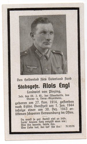 Landwirt von Pinzing. Inh. des EK 2.kl, der Ostmedaille, des Sturm.- u. Verw.-Abzeichens. Infolge einer am 30. Dez. 1943 erlittenen schweren Verwundung im Osten gestorben.