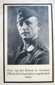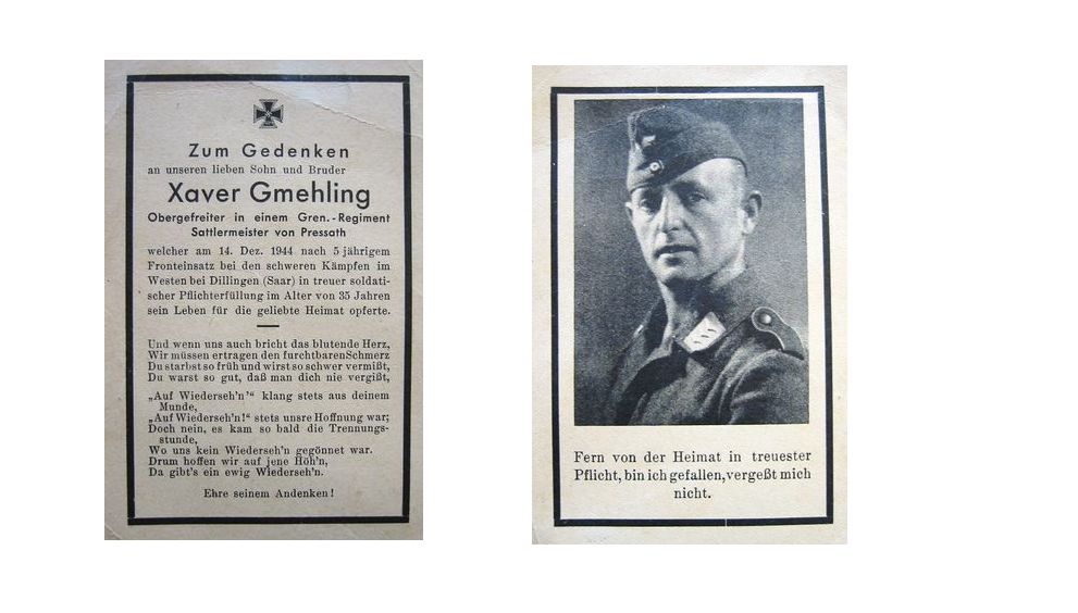 Sattlermeister von Pressath. Welcher nach 5 jährigem Fronteinsatz bei den schweren Kämpfen im Westen bei Dillingen (Saar) in treuer soldatischer Pflichterfüllung am alter von 35 Jahren sein Leben für die geliebte Heimat opferte