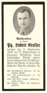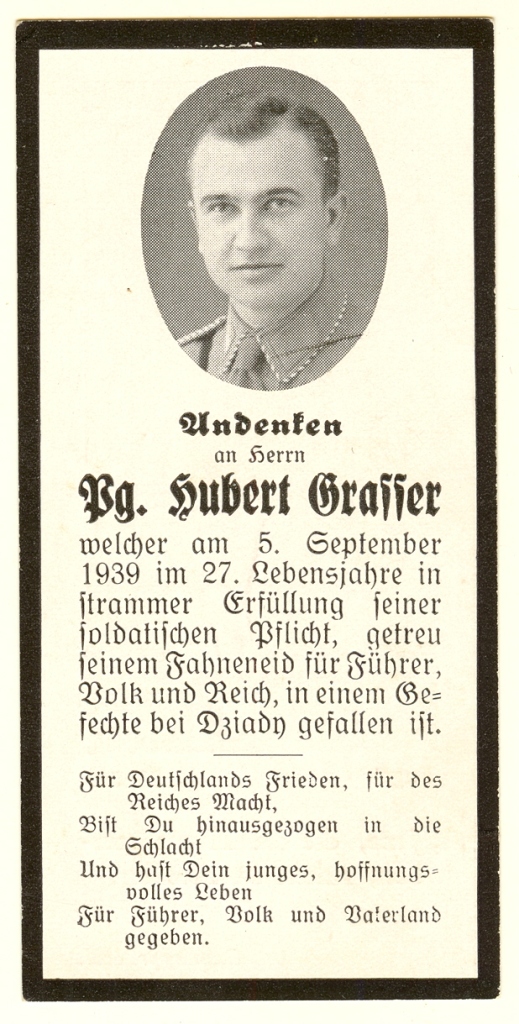 Im 27.Lebensjahre in strammer Erfüllung seiner soldatischen Pflicht, getreu seinen Fahneneid für Führer, Volk und Reich, in einem Gefecht gefallen ist.
