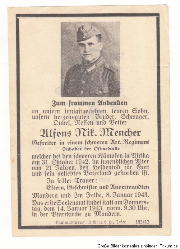Inhaber der Ostmedaille. Im jugendlichen Alter von 21 Jahren, den Heldentod für Gott und sein geliebtes Vaterland gestorben ist.
