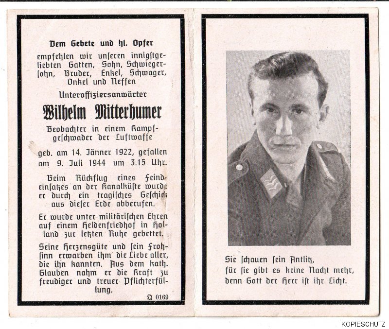 Beobachter in einem Kampfgeschwader der Luftwaffe. Beim Rückflug eines Feindeinsatzes an der Kanalküste wurde er durch ein tragisches Geschick aus dieser Erde abberufen.