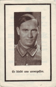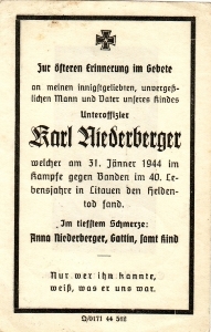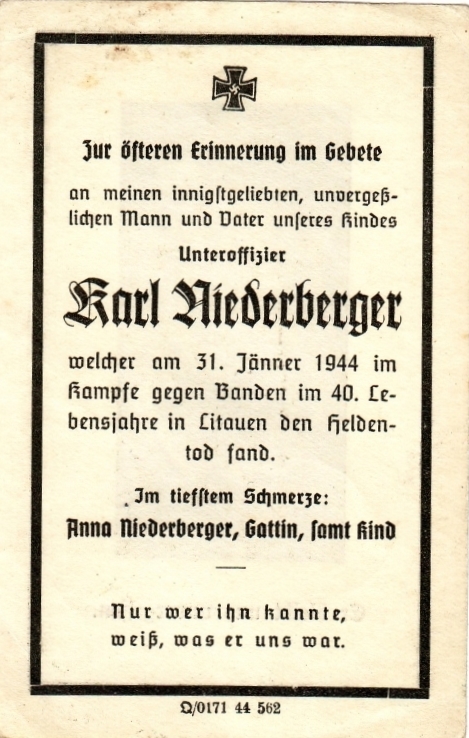 Im Kampfe gegen Banden im 40.Lebensjahre in Litauen den Heldentod fand. In tiefstem Schmerze: Anna Niederberger, Gattin, samt Kind