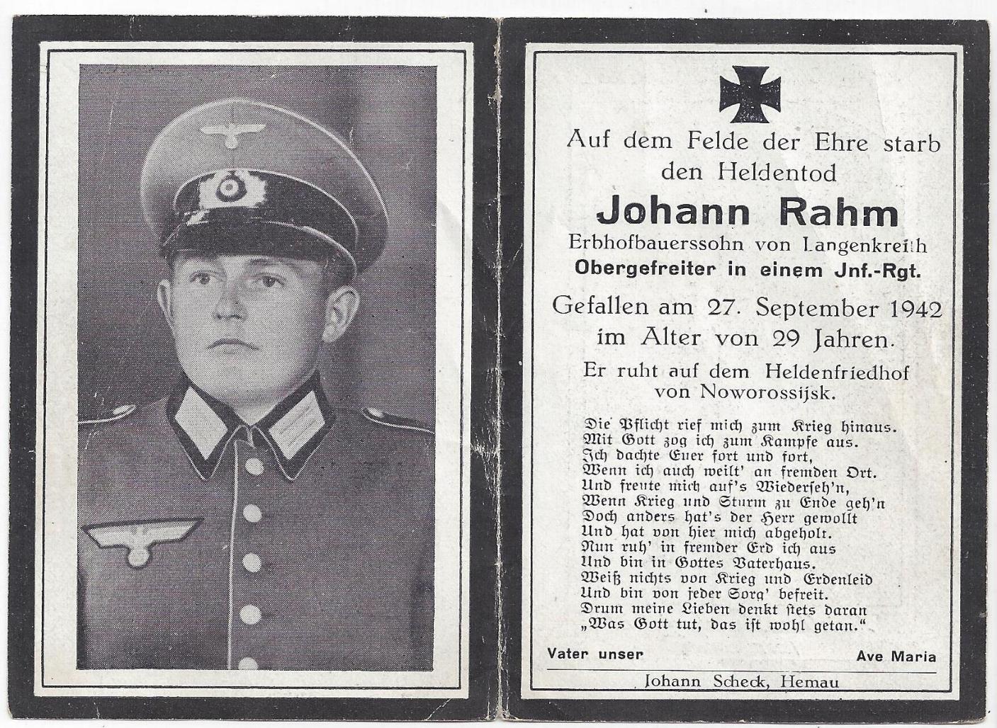 Erbhofbauernsohn von Langenkreith. Gefallen im Alter von 29 Jahren. Er ruht auf dem Heldenfriedhof von Noworosijsk