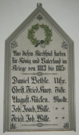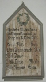 Tafeln: Aus diesem Kirchenspiel starben für König und Vaterland im Kriege von 1813 bis 1815 Aus diesem Kirchenspiel starben für König und Vaterland im Kriege von 1914 bis 1918