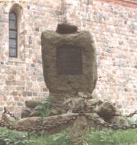 An der Seite der Kirche auf einem großen Findling ein Granatenfragment. An der Vorderseite eine Namentafel.