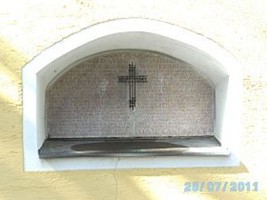 Rundbogennische Kirche St. Korbinian mit Inschrift und den Namen der Opfer des 2. Weltkrieges. Mittig ein eisernes Kreuz. An der Außenmauer eine Steintafel mit den Opfernamen des 1. Weltkrieges.