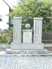 Denkmal aus Granitstein am Ortseingang. Auf einem Stufenpodest rechts und links eine Säule mit den Namen der Weltkriegsopfer. Mittig ein Granitblock mit Inschrift und als Abschluss eine Steinkugel mit Metallkreuz.
