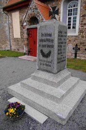 gekrönt von einem Adler; Kriegerdenkmal vor der Kirche, viereckige Stele auf abgestuftem Sockel, gekrönt von einem