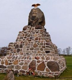 Denkmal 1813 für das Gefecht bei Möckern, hohe abgestufte Feldstein Pyramide mit aufgesetztem Findling und